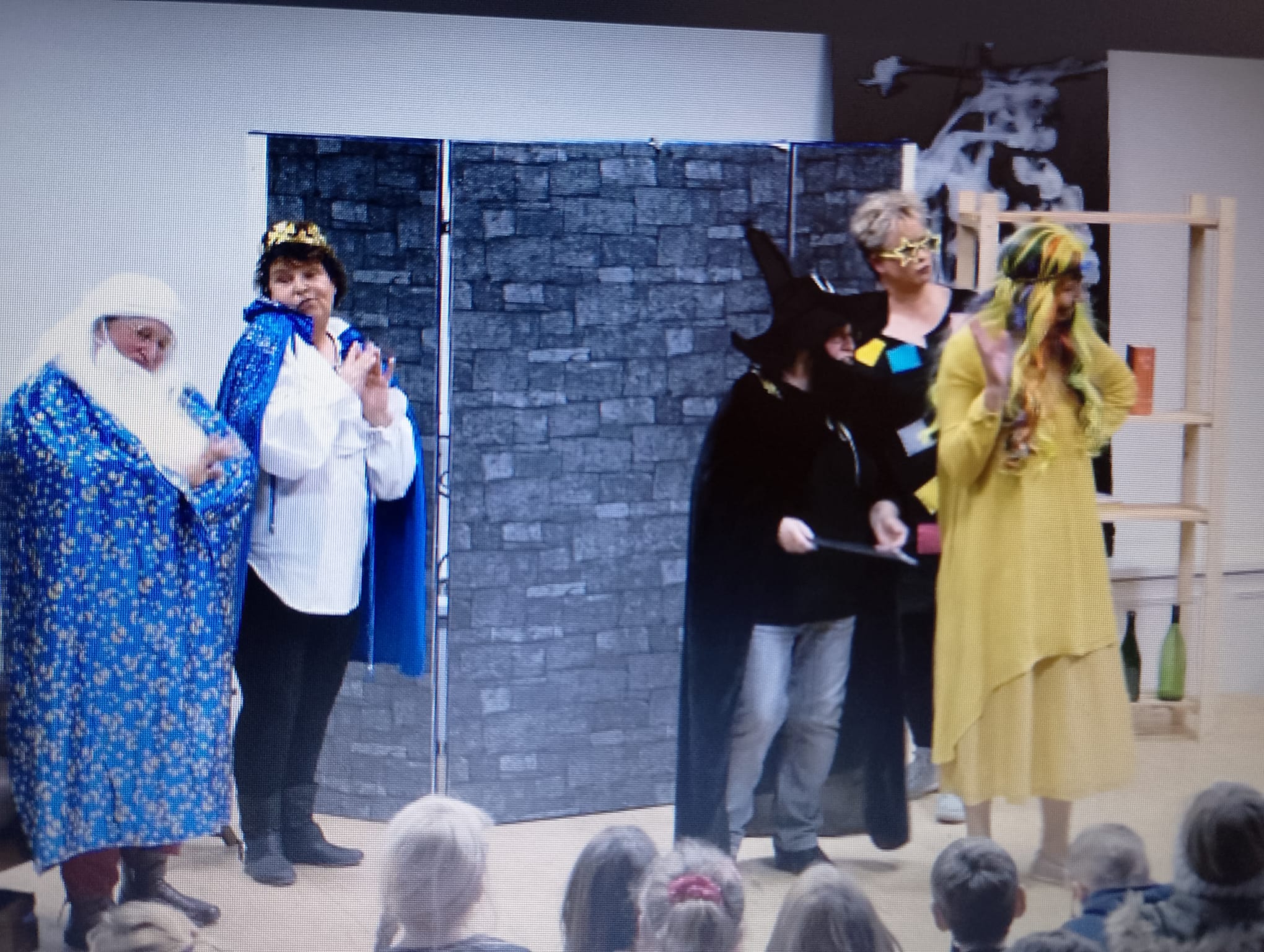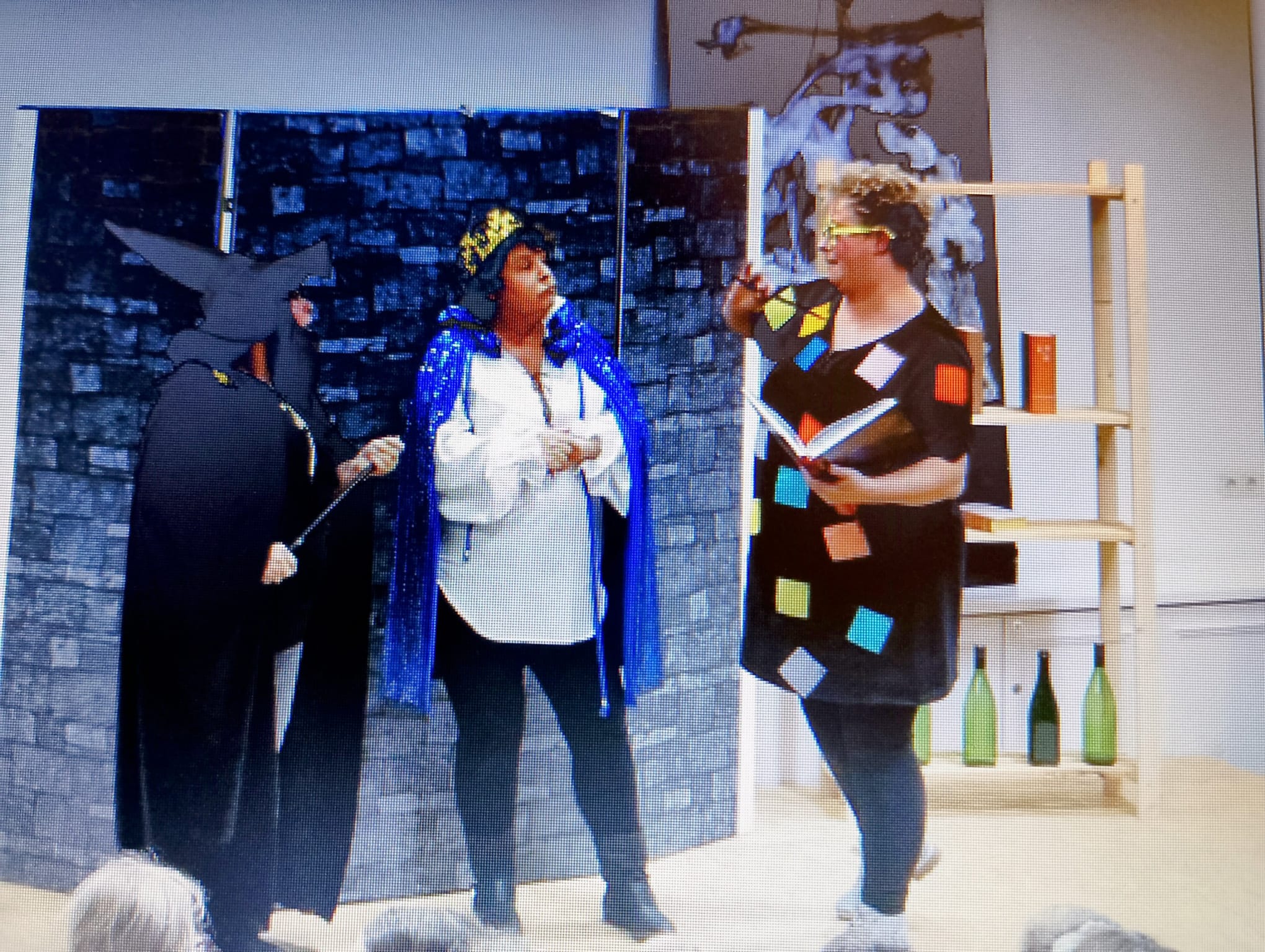 Die Tochter von Kai und Frauke Sukiennik wollte so gerne einmal bei uns mitspielen. So habe ich ein Stück gesucht, in dem auch ein Kind mit wenig Text mitspielen kann. Das zweite Kind Karolina spielte in der Barkelsbyer Schule in der Theater-AG. Der Schuldirektor Herr Düllmann gab uns die Erlaubnis, die beiden Viertklässler für unser Stück „auszuleihen“ – es waren ja auch zwei Vorstellungen am Vormittag, während des Unterrichts vorgesehen. Kai konnten wir zum Spielen locken, indem wir ihm die Rolle des Königs angeboten hatten (wenig Text, tolle Rolle). Uwe Mohr ging in seiner Rolle sichtlich auf – frech und an Türen lauschend. Es war eine Freude zuzusehen, wie toll auch das Zusammenspiel mit den Kindern war.
